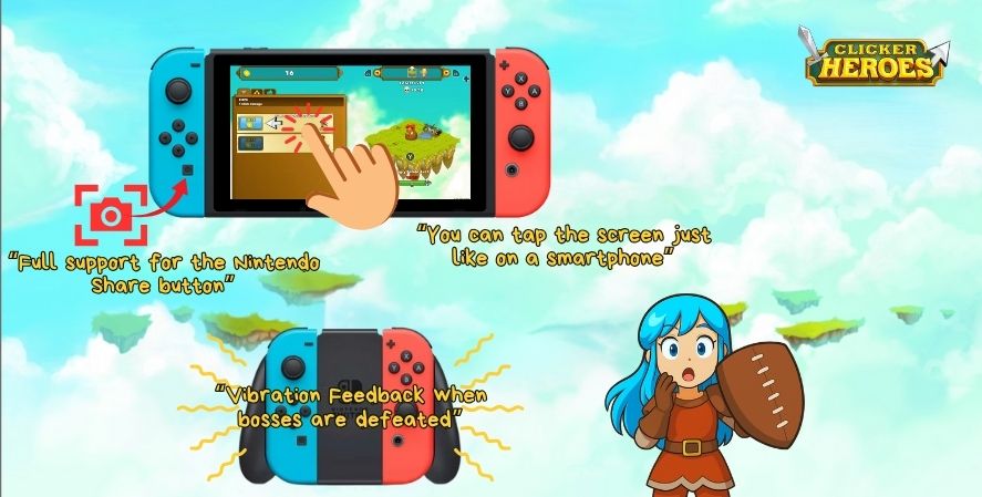 The Clicker Heroes Switch version has been adapted with new control schemes and interface updates to suit the hybrid console format.